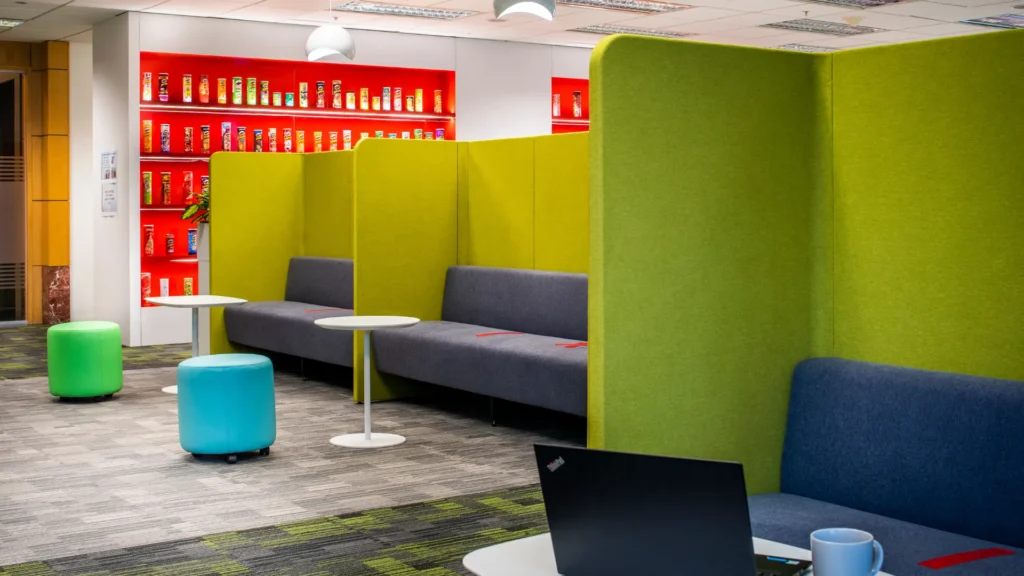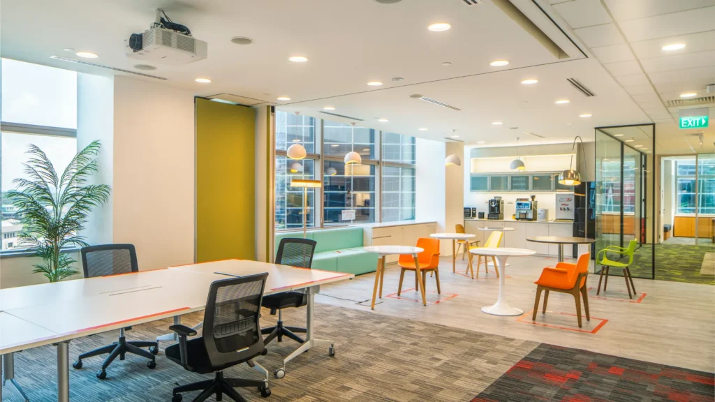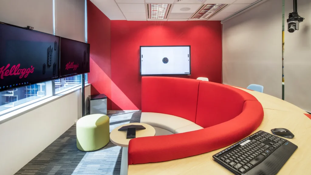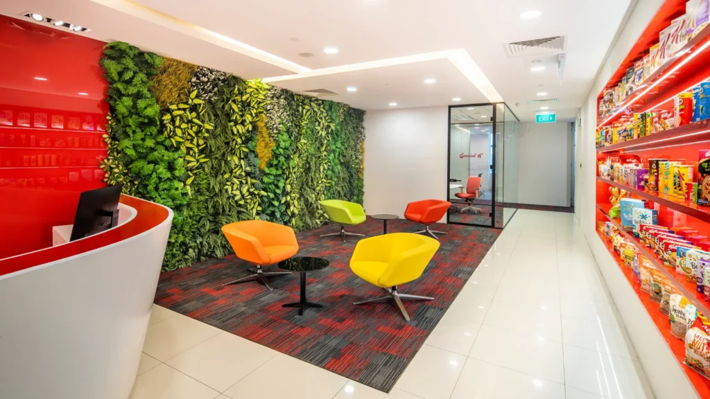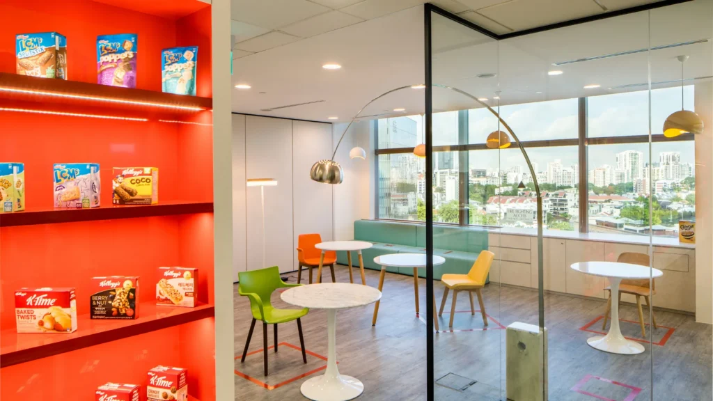 AlfaTech Asia renovated Kellogg’s regional office at Novena Square, creating a more dynamic environment to enhance communication and collaboration. The new design introduced flexible meeting rooms, collaboration areas with increased seating, and whiteboard-equipped zones to encourage brainstorming and interaction. Red—the brand’s signature color—was incorporated into the interior design for stronger identity and energy. To reinforce brand culture, Pringles cans were repurposed as display features, adding a creative touch that highlighted the company’s products within the workspace.